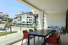 Dispone de dos amplios dormitorios con baños privados, salón comedor con cocina americana, terraza grande con espectaculares vistas al mar, piscina y jardines del residencial.