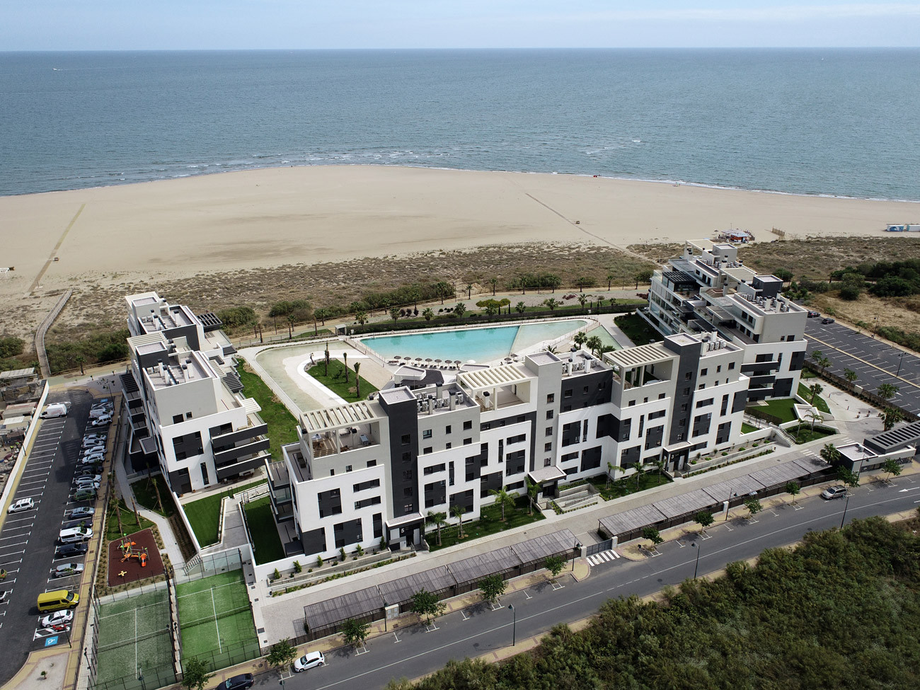 Residencial privado de alto standing en primera línea de playa Punta del Moral, con piscinas, estanques, zona ajardinada, gimnasio totalmente equipado, pádel y zona infantil.
