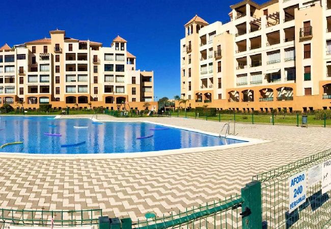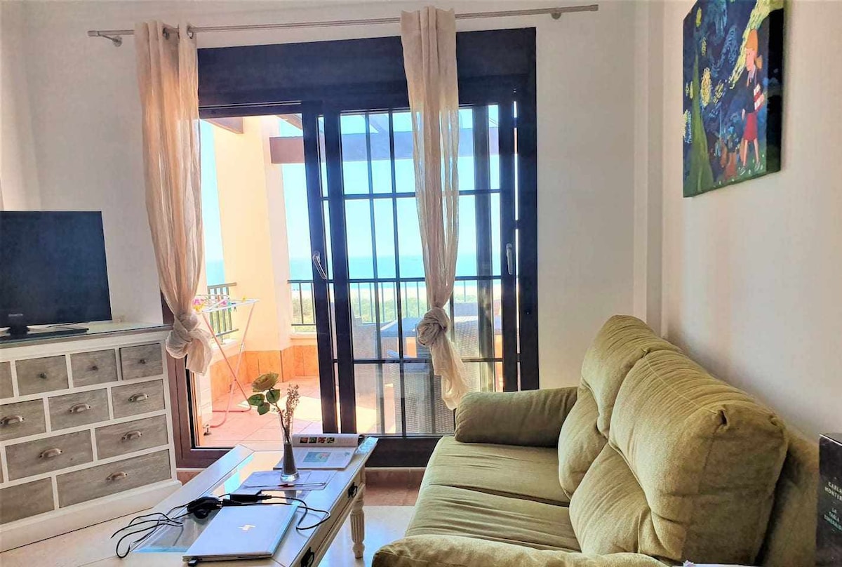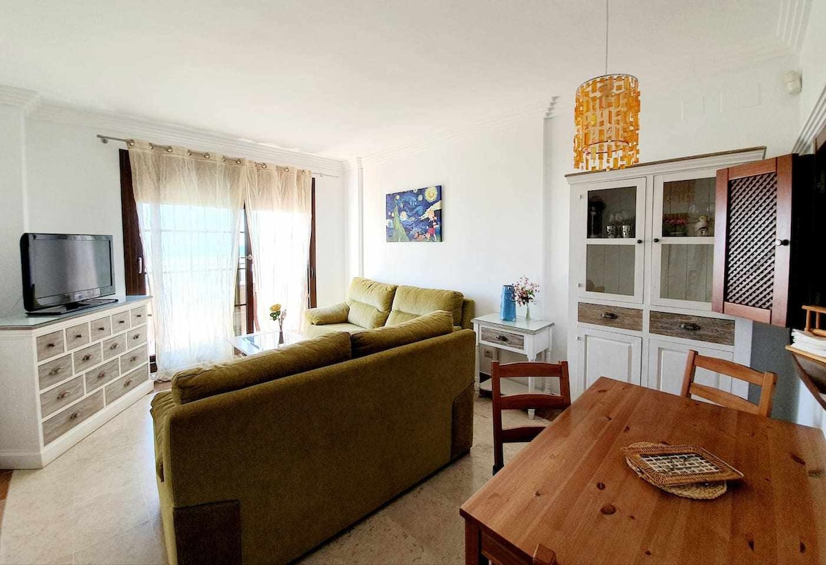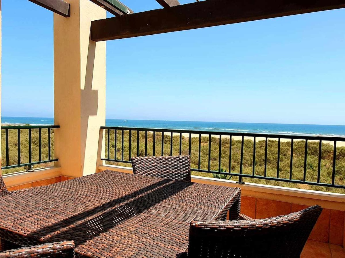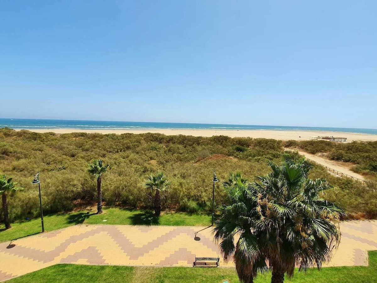 Apartamento de 2 dormitorios en primera línea de playa y urbanización con piscina, pádel y jardines.