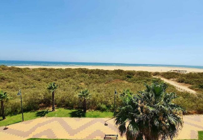 Apartamento de 2 dormitorios en urbanización Las Dunas, situado en primera línea de playa y con terraza con vistas al mar.